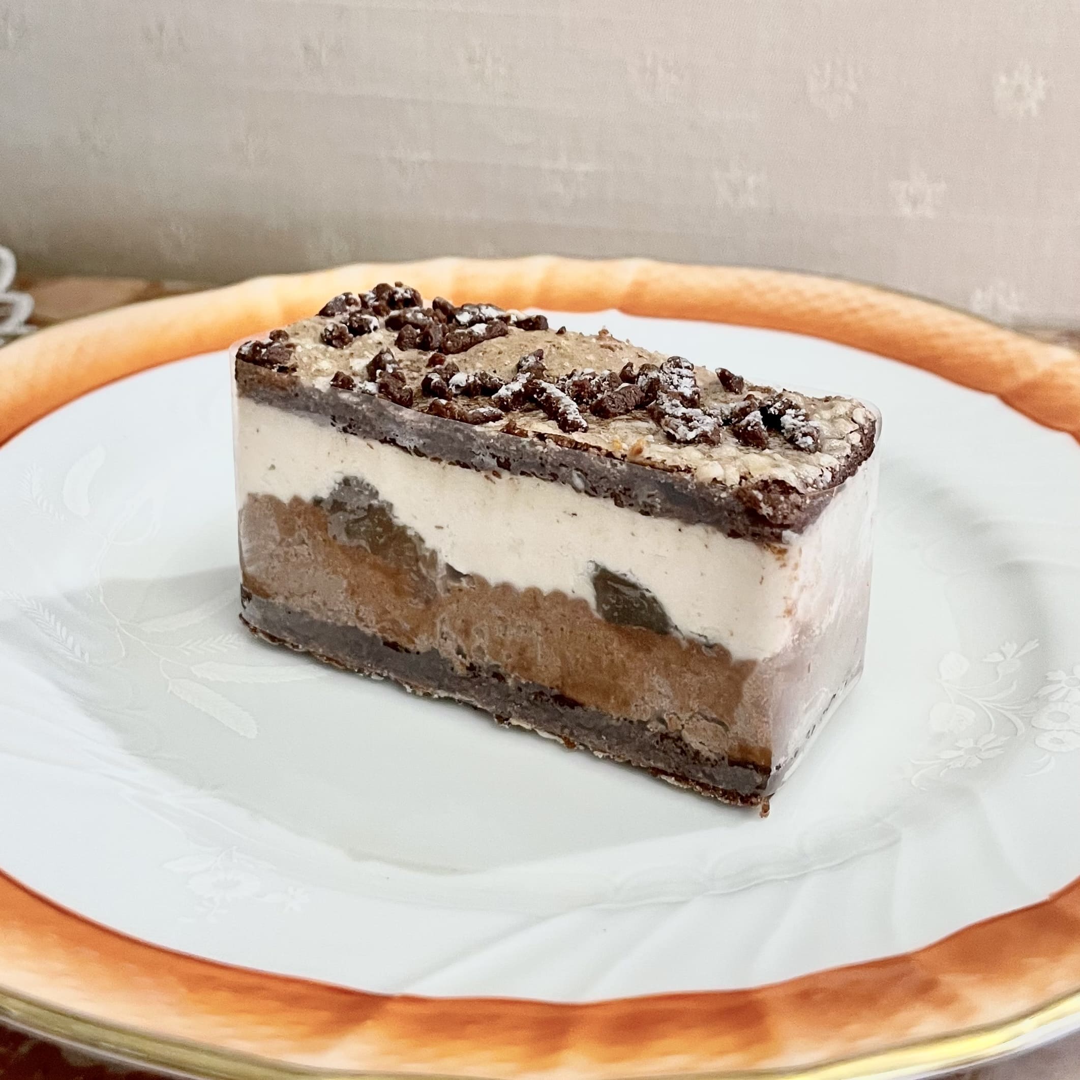 個性的なチョコレートの生地の間に ホワイトチョコレートの力強いクリームが、 たっぷりのマロングラッセと共に 季節を楽しませてくれるようです。